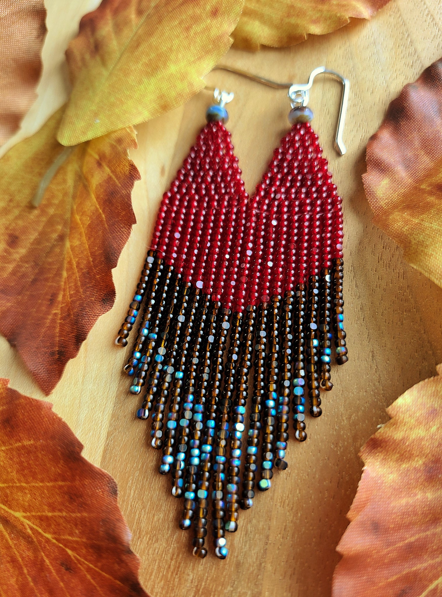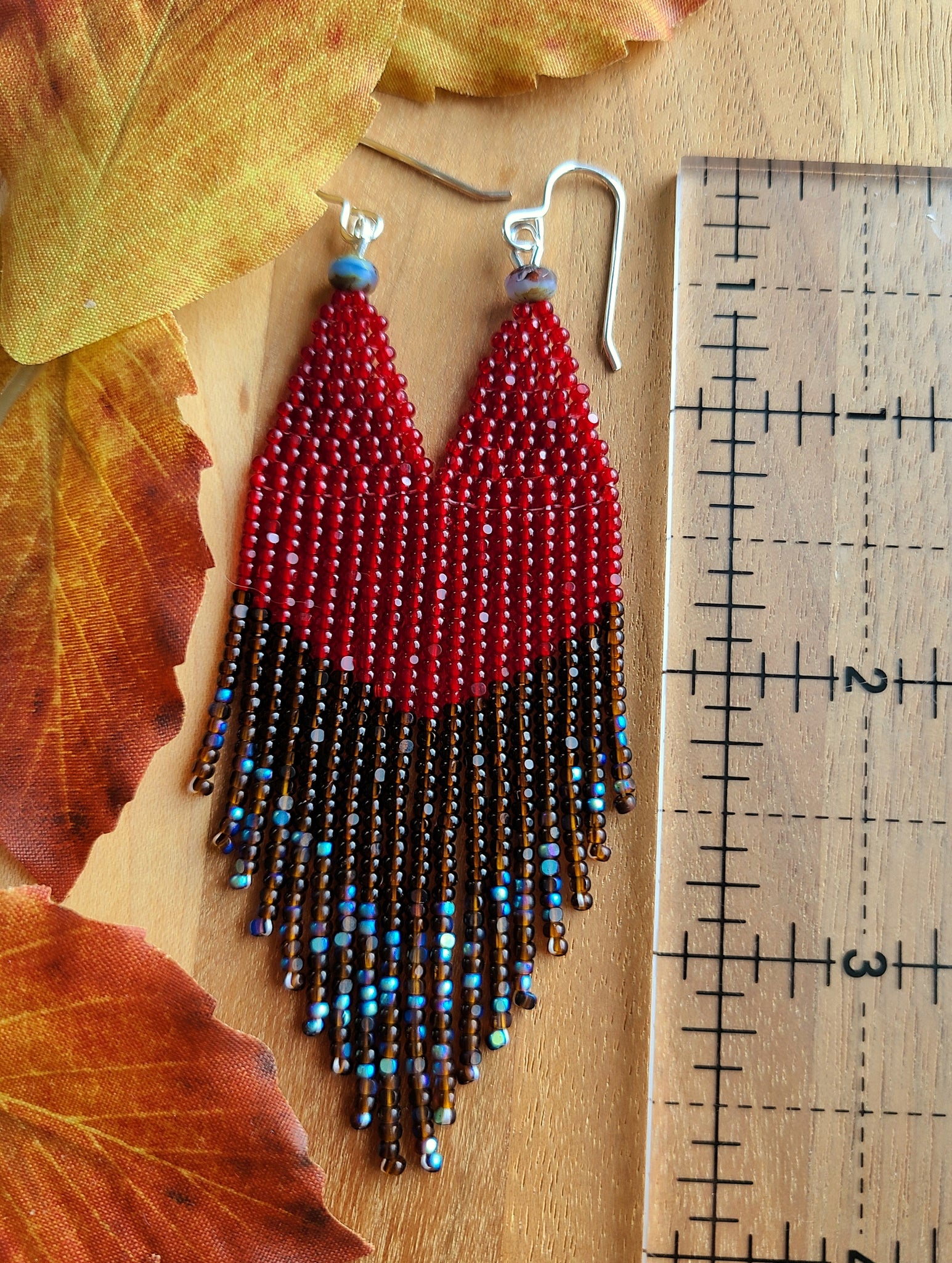 Made with charlotte two-cut glass beads, these earrings are elegant and sparkle in every light. They feature an amethyst and stone colored glass bead and hang just under 4" long on sterling silver ear hooks.